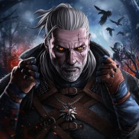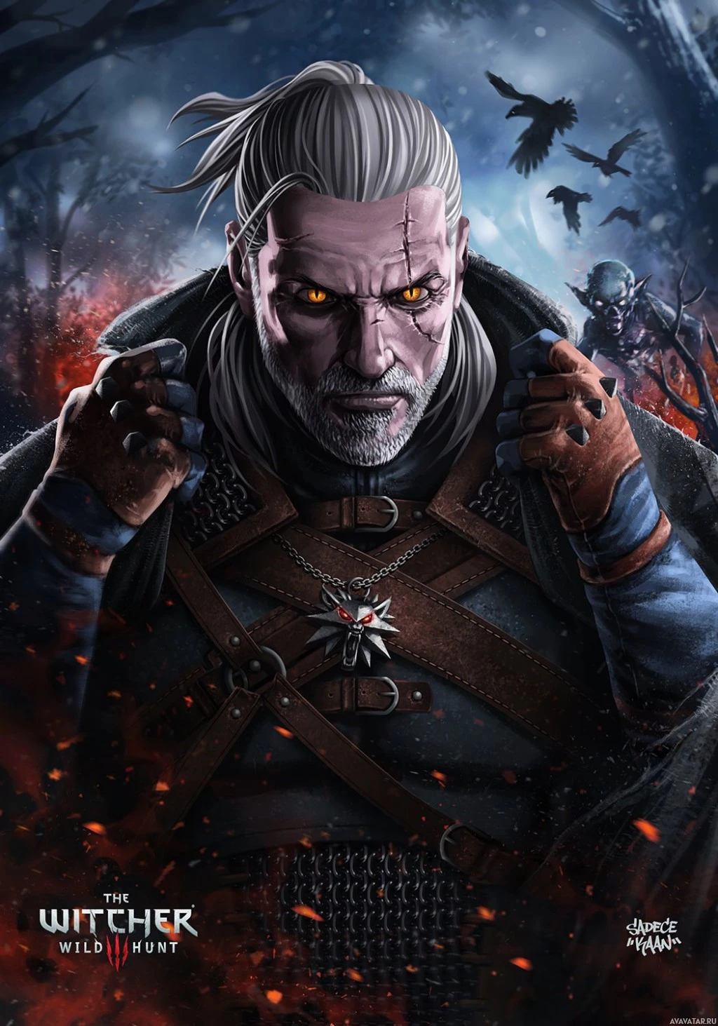 The image depicts the character Geralt of Rivia from the "The Witcher 3: Wild Hunt"