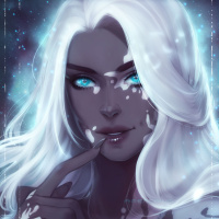 floating particles and a hint of a nebula. This character appears to be a fantasy or science fiction representation, possibly a mermaid given the aquatic elements in her attire and the overall setting.