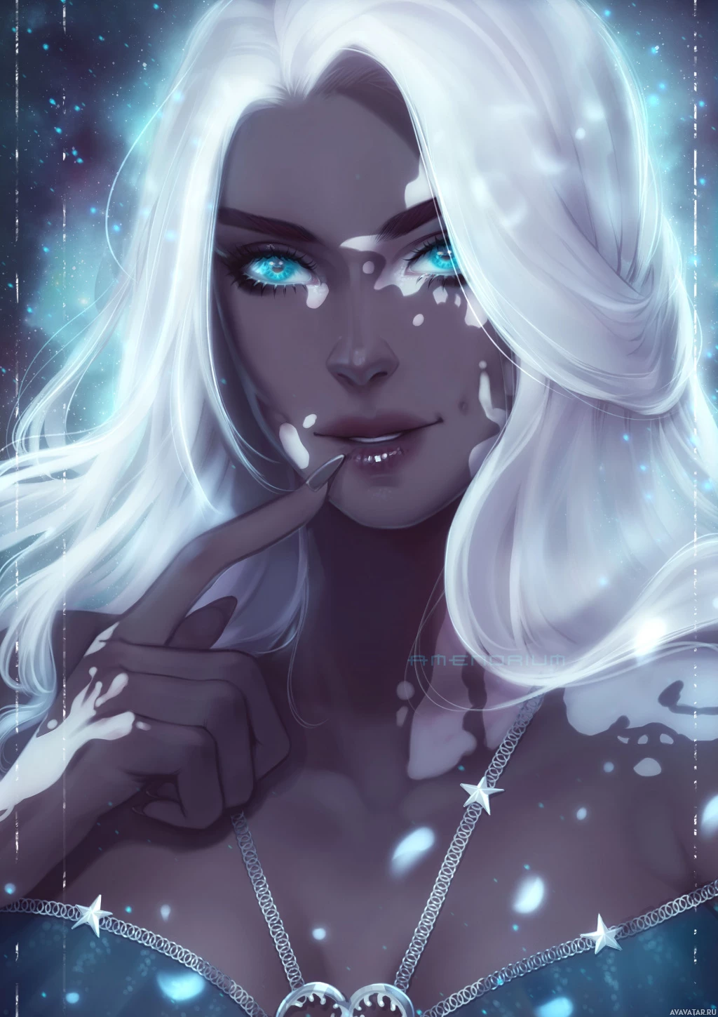 a female character with white hair. She is smiling and pointing to her mouth with one hand, as if she's showing off her teeth or the design on her lips. Her outfit consists of a blue and silver dress that has a celestial or cosmic theme, with stars and galaxy-like patterns. The background features a space-like environment with