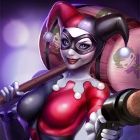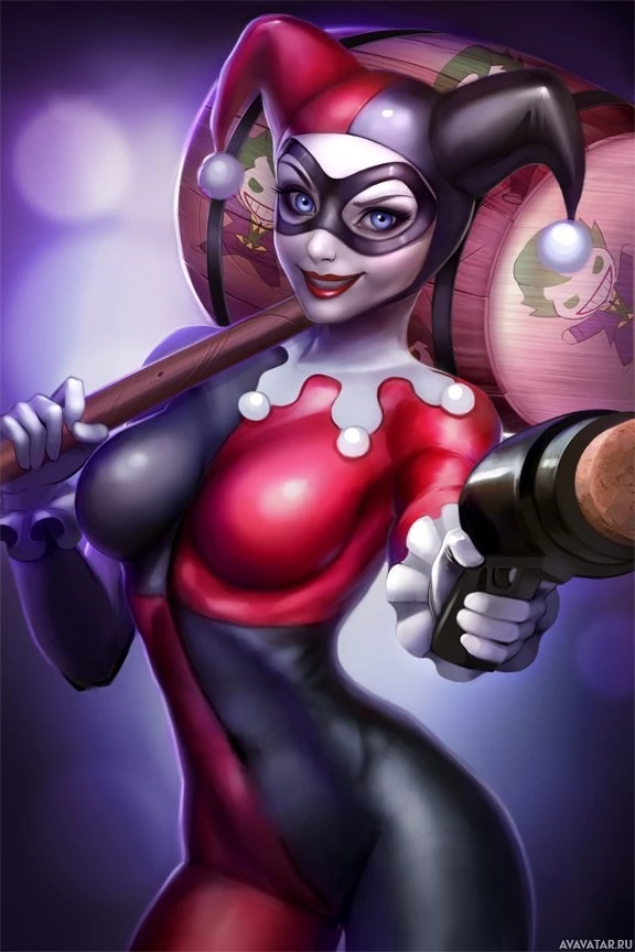 Harley Quinn from the DC Comics universe. She is dressed in her signature red, white, and black outfit with her iconic face paint, including a bright red smile and