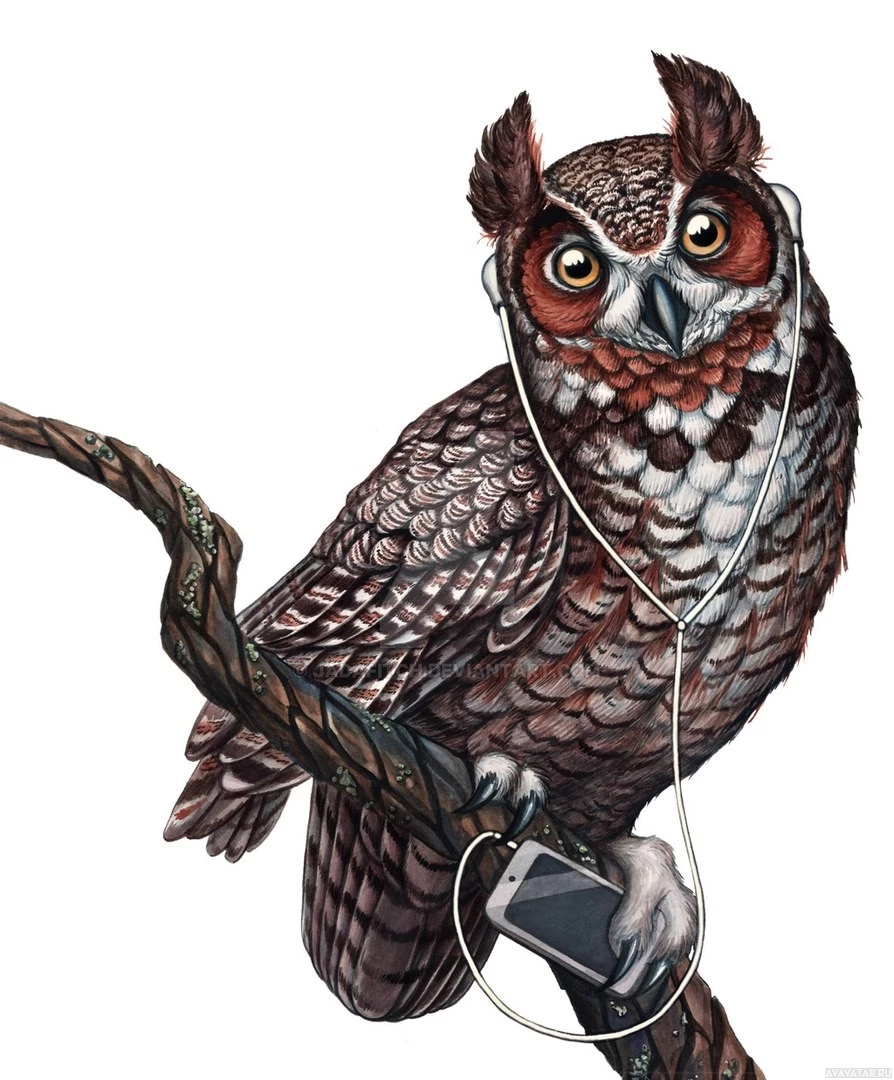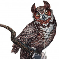 The image features a stylized illustration of an owl with headphones around its head. The owl is depicted with a somewhat surprised or intrigued expression while it holds what appears to be a smartphone with the volume control visible on the side. It's holding the phone in one claw and the headphones in the other, as if it were listening to music or perhaps engaging with