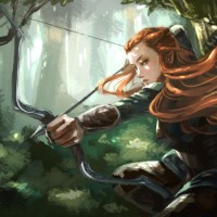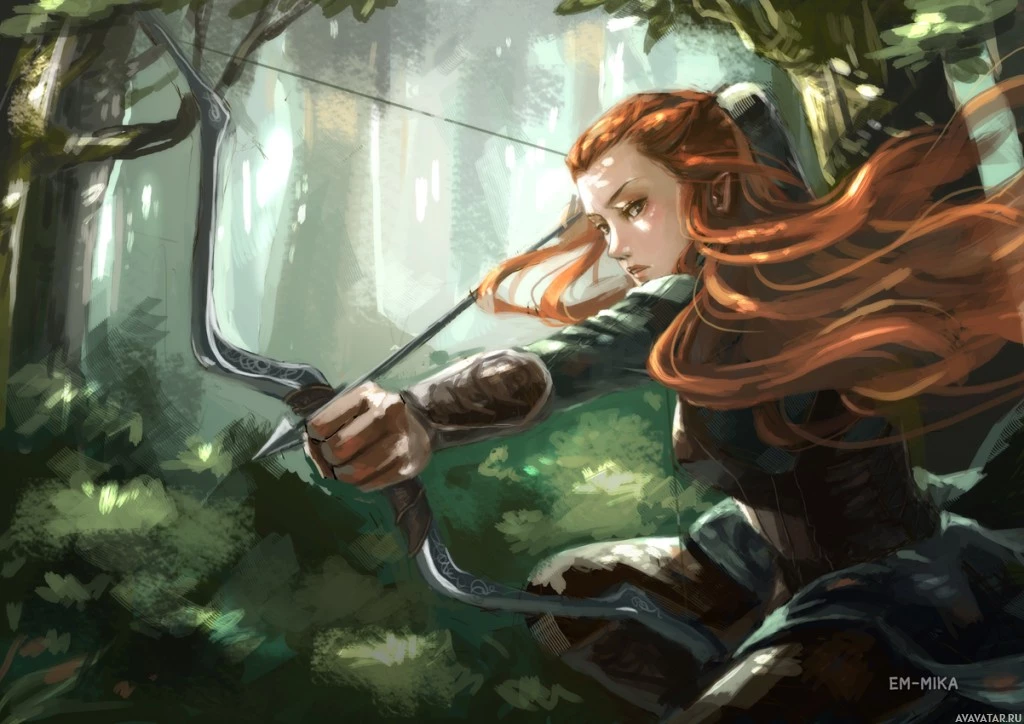 red hair and is holding a bow, aiming at something in the distance. They are wearing