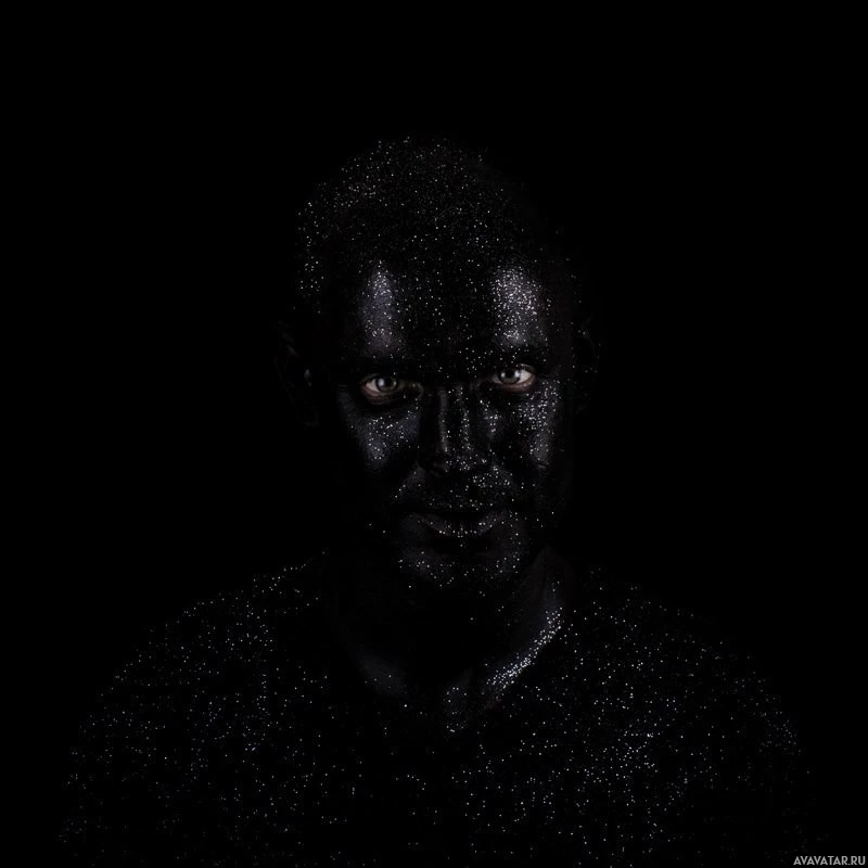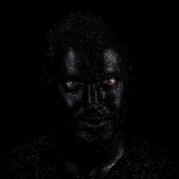 body paint covering his skin, giving him a dark appearance. He is wearing