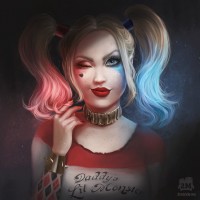 red hair with black lipstick on the other side, which is typical for her character. She has a smirk on her face and is dressed in her iconic Harley