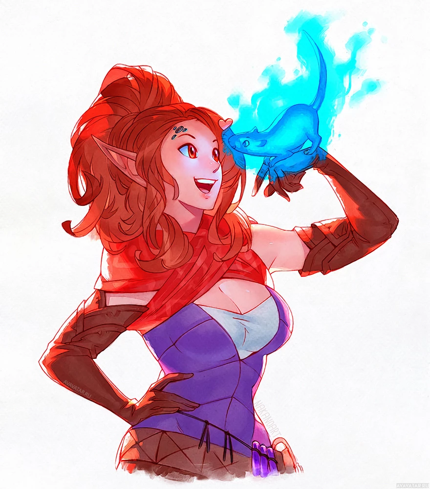 a fantasy character who appears to be an elf with red hair. She is wearing what looks like medieval or fantasy armor, and she has