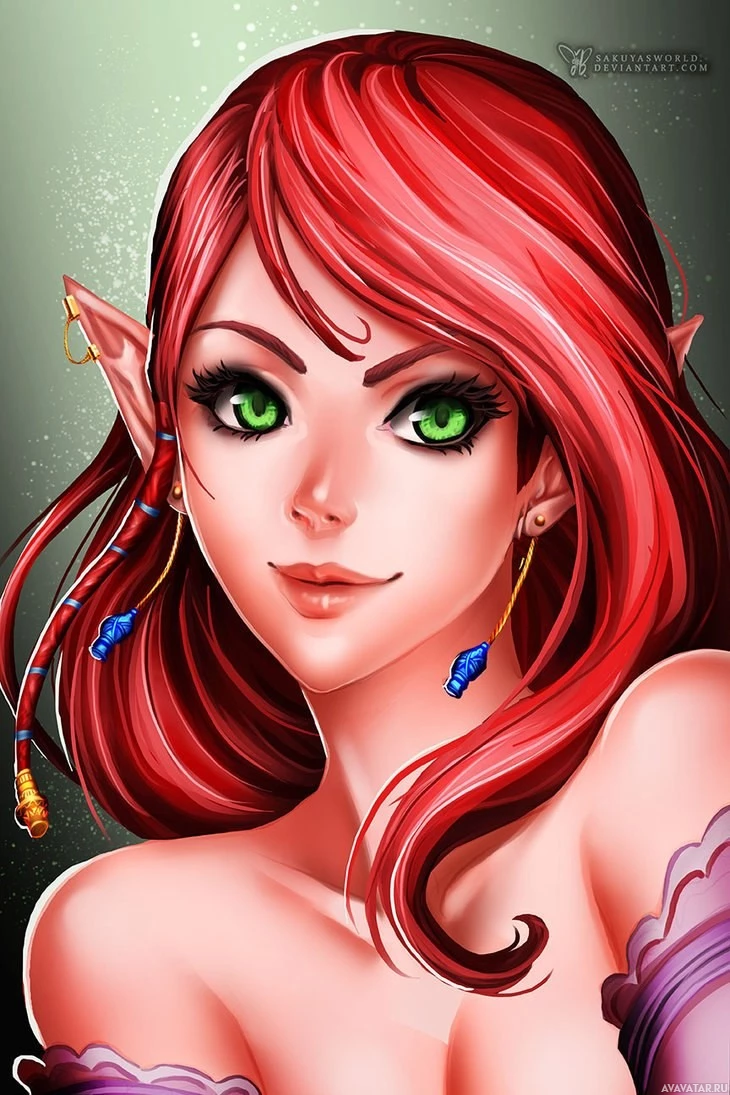 female character with red hair, which is often associated with fantasy or elf characteristics. She has pointed ears, suggesting an elven or mythical creature theme. Her expression is friendly and she appears to be looking directly at the viewer. The artwork includes shading and highlights that give depth to her features, enhancing her three-dimensional appearance.