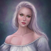 The image shows a digital artwork of a female character with white hair. She has a serene expression and is wearing what appears to be a medieval-style outfit, suggesting a fantasy or historical context for her appearance. Her hair is styled in a manner consistent with historical fashion from certain time periods, giving her an ethereal and timeless look.