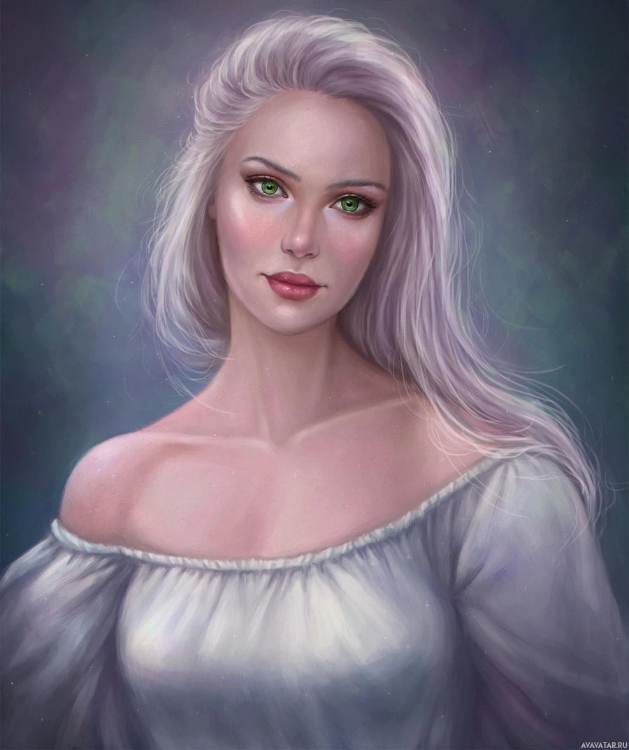 На картинке изображено цифровое произведение женского персонажа с белыми волосами. Она имеет безмятежное выражение и носит то, что кажется нарядом в средневековом стиле, предлагая фантазию или исторический контекст для ее внешности. Ее волосы стилизованы в соответствии с исторической модой определенных периодов времени, что придает ей эфирный и вневременный вид.