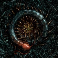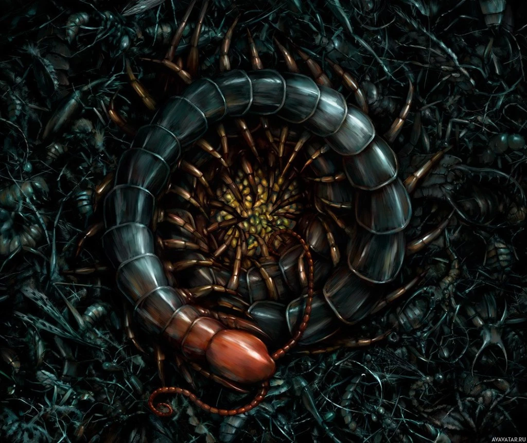 The image depicts a creature that resembles a large, segmented worm with numerous legs, reminiscent of an insect or a fictional