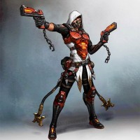 a female character. She is wearing a red and white suit with a helmet that has a visor, and she is holding two guns in each hand, pointing them forward. Her pose suggests action or readiness for combat. The character is set against