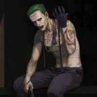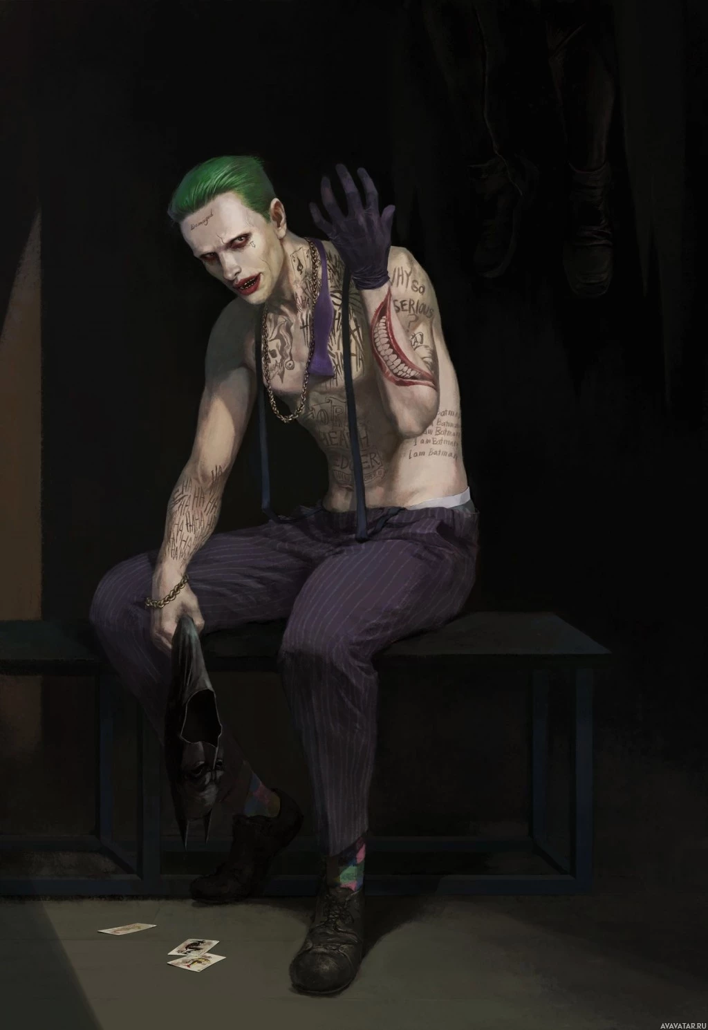 the Batman universe. This version of the Joker appears to be sitting on a bench, dressed in his iconic
