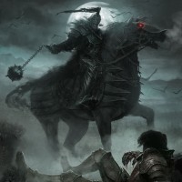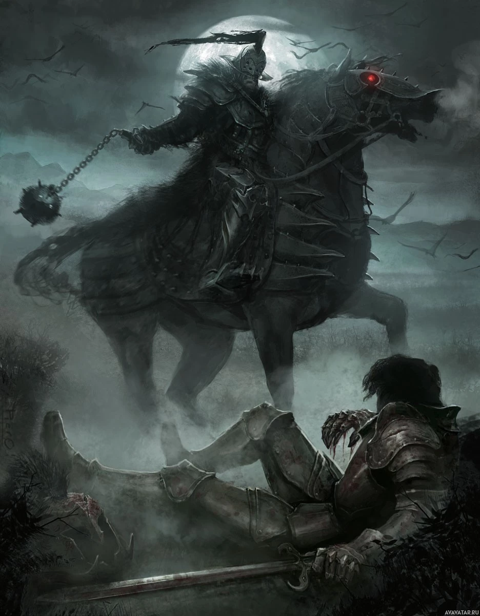 the red eyes and the moon in the background suggesting nighttime or a supernatural setting. The rider is wearing armor and holding a staff or wand that might imply some sort of magical or evil power. In front of the horse, there's another figure who seems to be lying on the ground, possibly fallen or defeated by