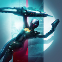 a futuristic scene with a female robot character at the center. She is holding a pistol in one hand and appears to be in motion, suggesting action or movement. The character has a sleek,