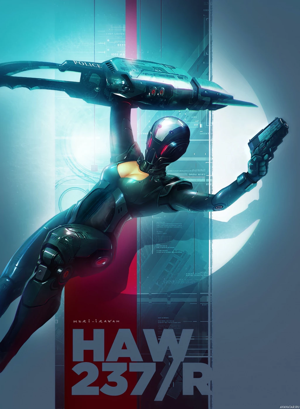 tech environment, possibly set within a spacecraft or another advanced facility. In the upper right corner of the image, there's text that reads "HAWK 237/R," which could be part of the title or a designation for the character or scenario depicted. The overall style and elements in the picture suggest it is related to