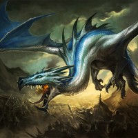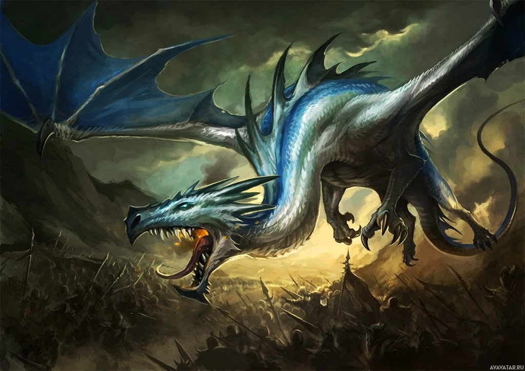 a fantastical scene featuring a dragon. This creature is depicted with large,
