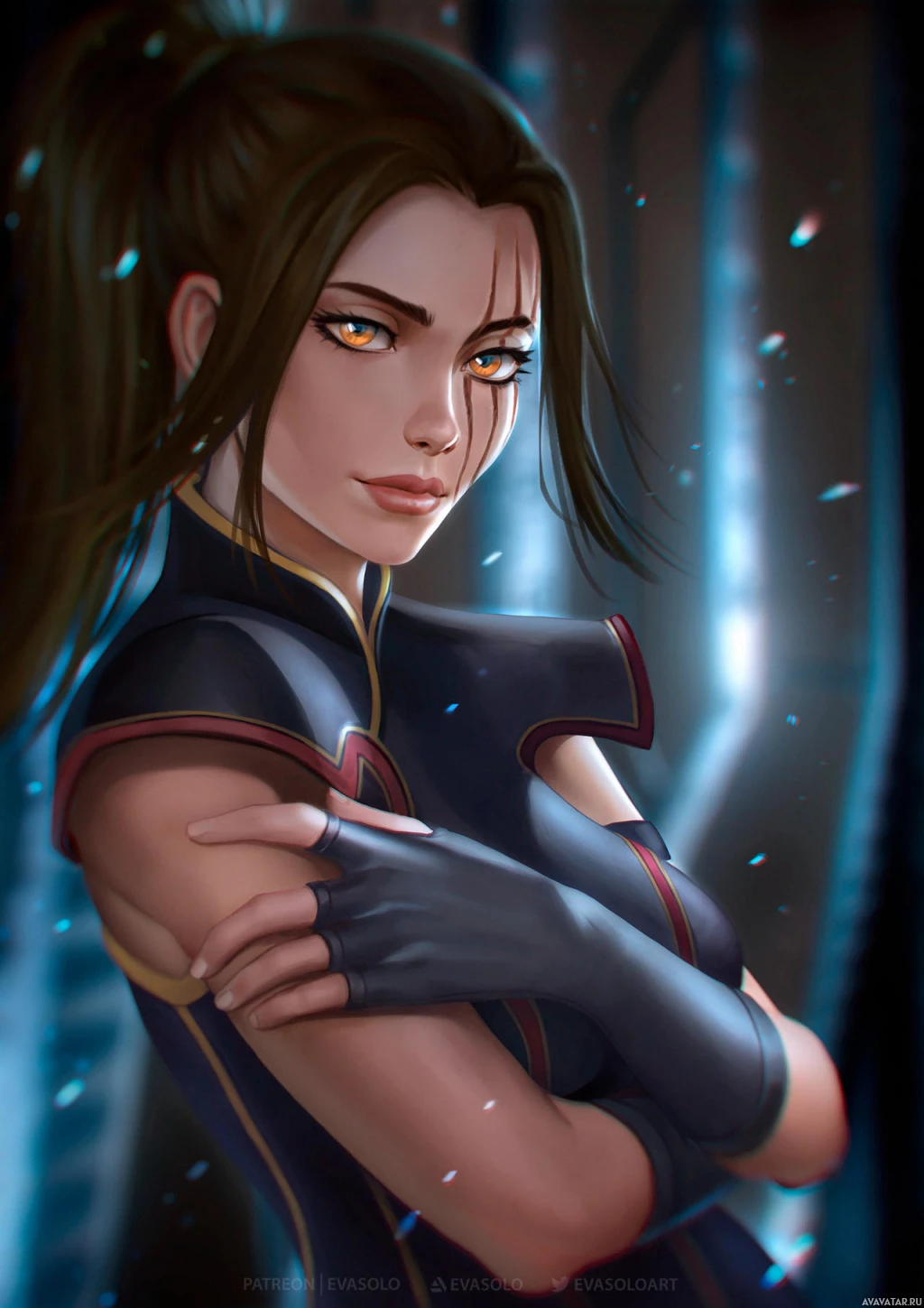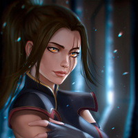 a young woman with brunette hair styled in a high bun. She is wearing what appears to be armor or a bodysuit, and the design suggests she might be from a fantasy or sci-fi setting. Her expression is neutral, and she seems to be in
