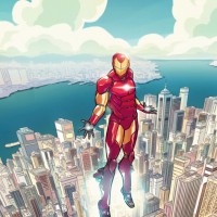 an urban landscape. He is dressed in his iconic red and gold suit and helmet, and there are