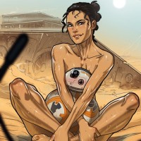 the Star Wars franchise, Rey. She is depicted sitting on a desert-like surface with a droid, BB-8, positioned in front of her. She appears to be in
