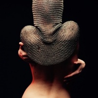 The image shows a woman from behind. She has her arms wrapped around herself and is wearing what appears to be a metallic or armored costume on her back, giving the impression of