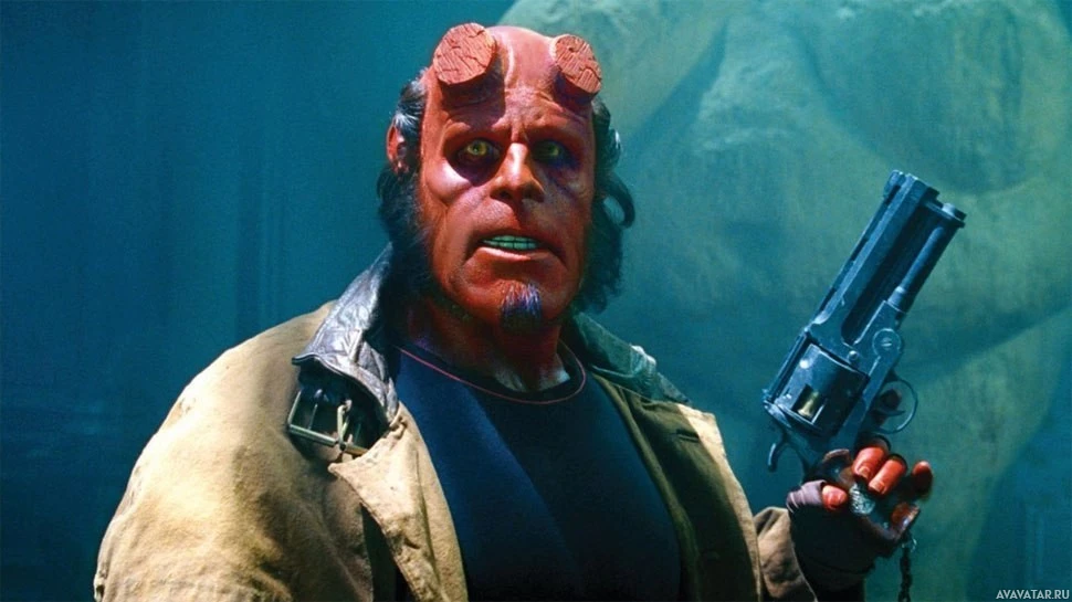 The image shows a character known as Hellboy. He is portrayed by actor Ron Perlman in