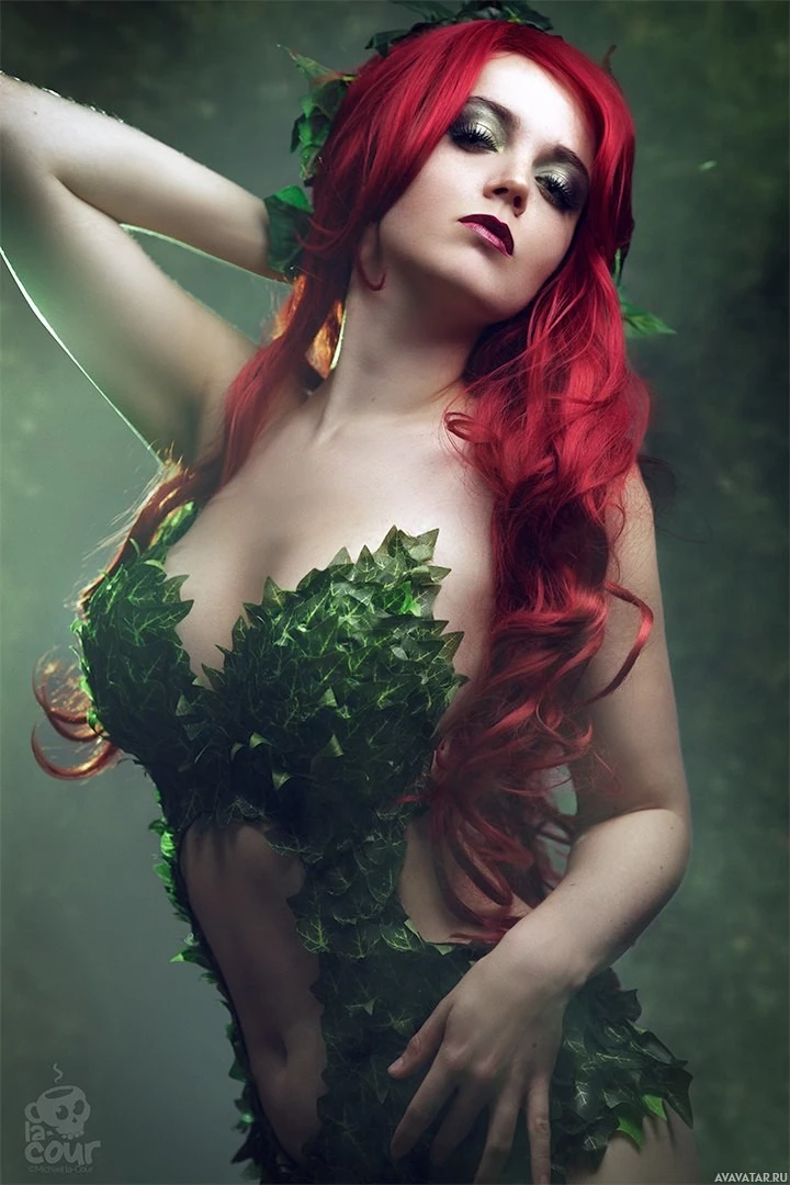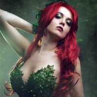 cosplay costume consists of green leaves on her body, which gives her an almost plant-like appearance reminiscent of the villainess Poison Ivy. The background is not clearly visible, but it appears to be a dimly
