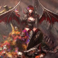 color tones, giving her a demonic appearance. She has sharp wings and horns, which are common characteristics of demons or