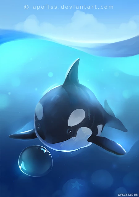 a killer whale, swimming underwater. The orca is depicted with its characteristic black body, white underside, and distinctive