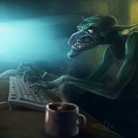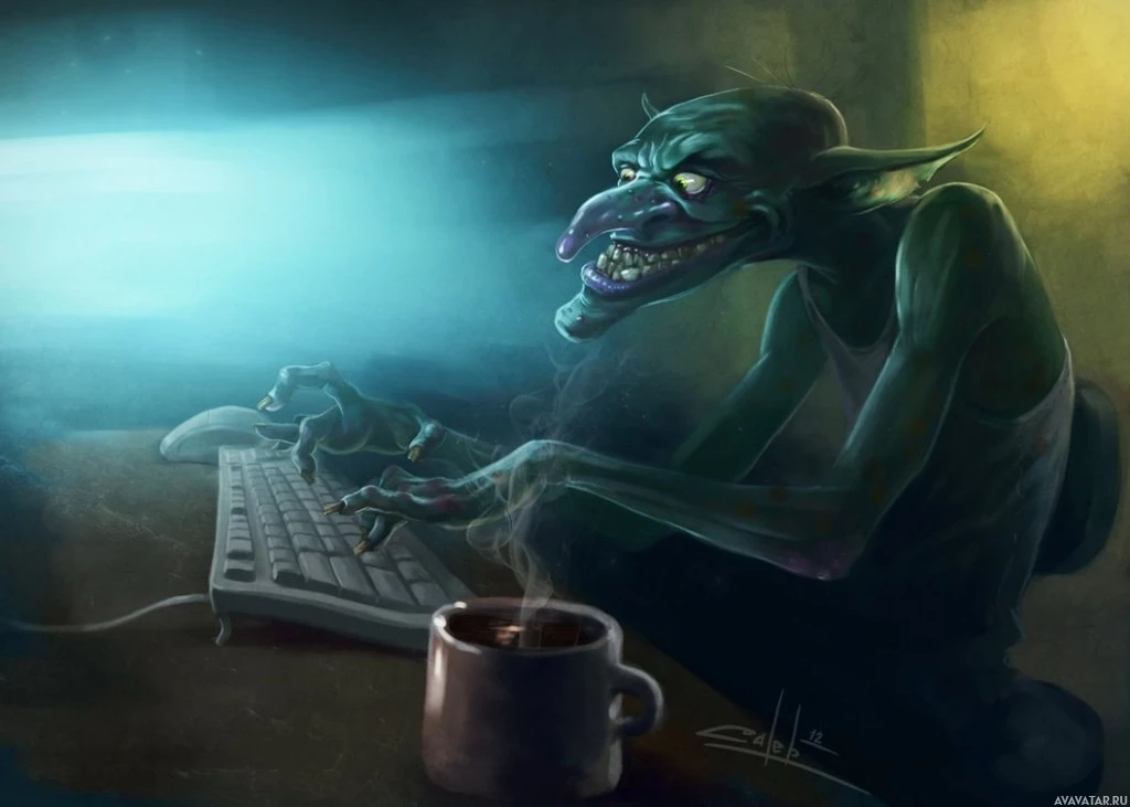 The image depicts a troll-like creature sitting at