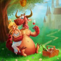 cloudy sky. The princess is holding what seems to be a wine glass, indicating that they might be celebrating or enjoying some
