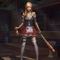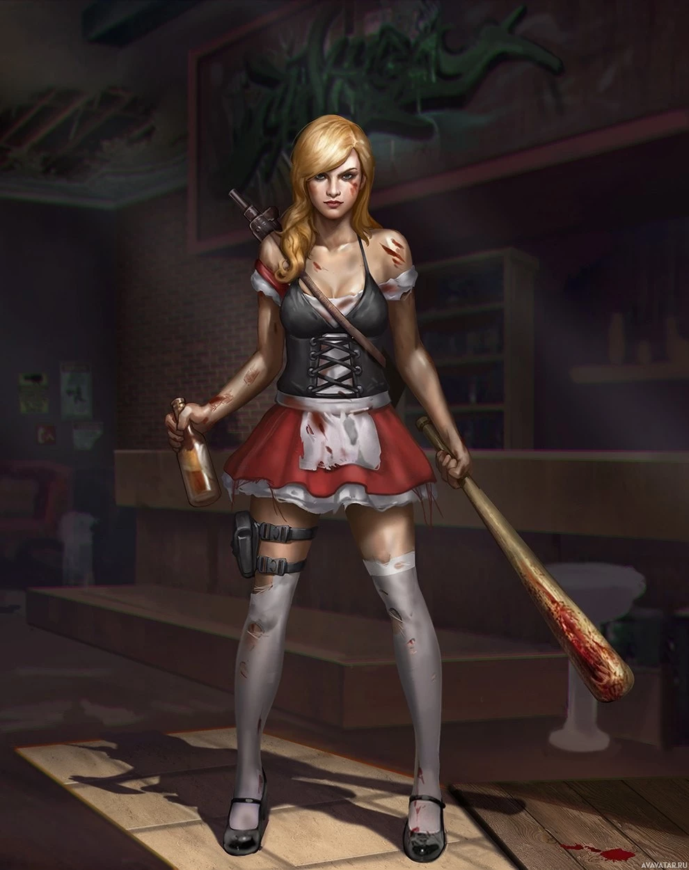 baseball bat, suggesting a theme of violence or horror. Her stance and expression are defensive, as if ready for combat. The background suggests an interior setting, possibly a bar or nightclub, with