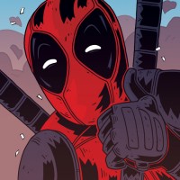 tech gloves, each adorned with two guns that appear to be part of his costume. The illustration captures Deadpool's exaggerated