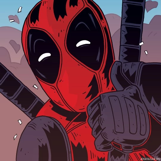 facial expression, which often includes crossed eyes or a blank stare, along with the character's distinctive red mask over his face. This is a typical depiction of Deadpool as he appears in
