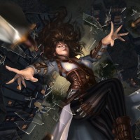 an impression of fantasy. There are multiple knives flying around her, which might indicate the action or effect of her