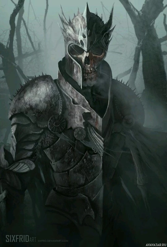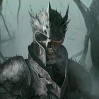 a skull design on top. The armor has spikes all over it, giving it an intimidating appearance. The background suggests a forest or woodland setting with