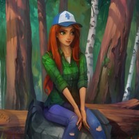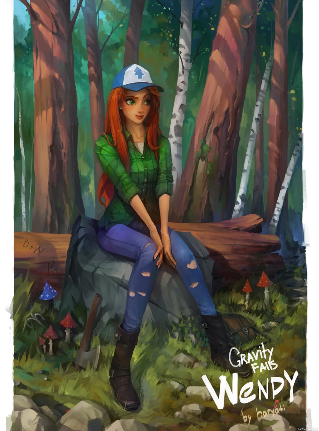 an animated character named Wendy, known from the animated television series "Gravity Falls." She is sitting on a wooden log in