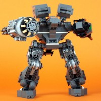 The image shows a Lego robot, which appears to be a custom creation. It's made from multiple Lego pieces and has a sturdy design with various attachments such as what looks like weapons or tools on its sides. The robot is standing upright against an orange background, displaying the intricacy and creativity involved in assembling such a model from building blocks.