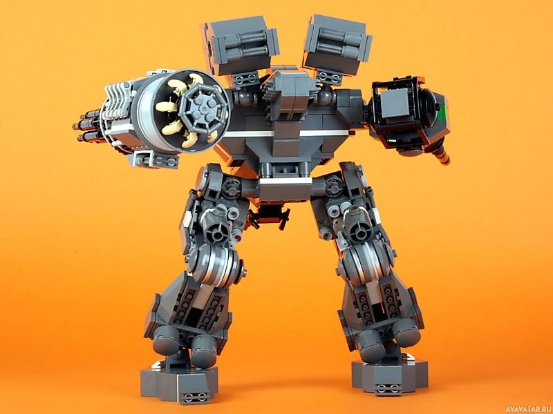 На картинке изображен робот Lego, который, по-видимому, является пользовательским созданием. Он сделан из нескольких частей Lego и имеет прочный дизайн с различными насадками, такими как оружие или инструменты. Робот стоит прямо на оранжевом фоне, демонстрируя сложность и креативность, связанные с сборкой такой модели из строительных блоков.
