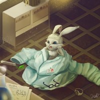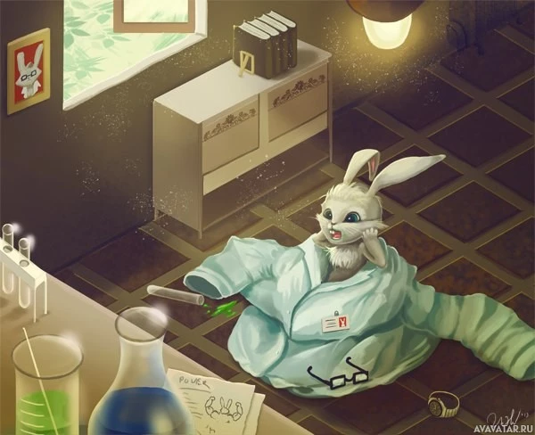 rabbit character who appears to be engaging in scientific activities, such as conducting experiments or working on a project. This is indicated by