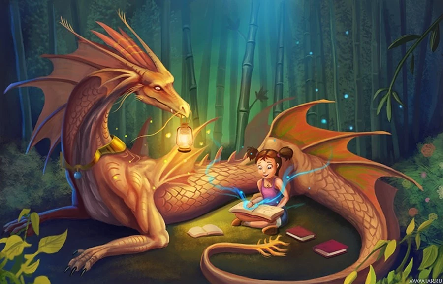 a fantasy scene where a young girl is sitting next to an animated, friendly dragon. They are both engaged in a shared activity as the dragon is holding