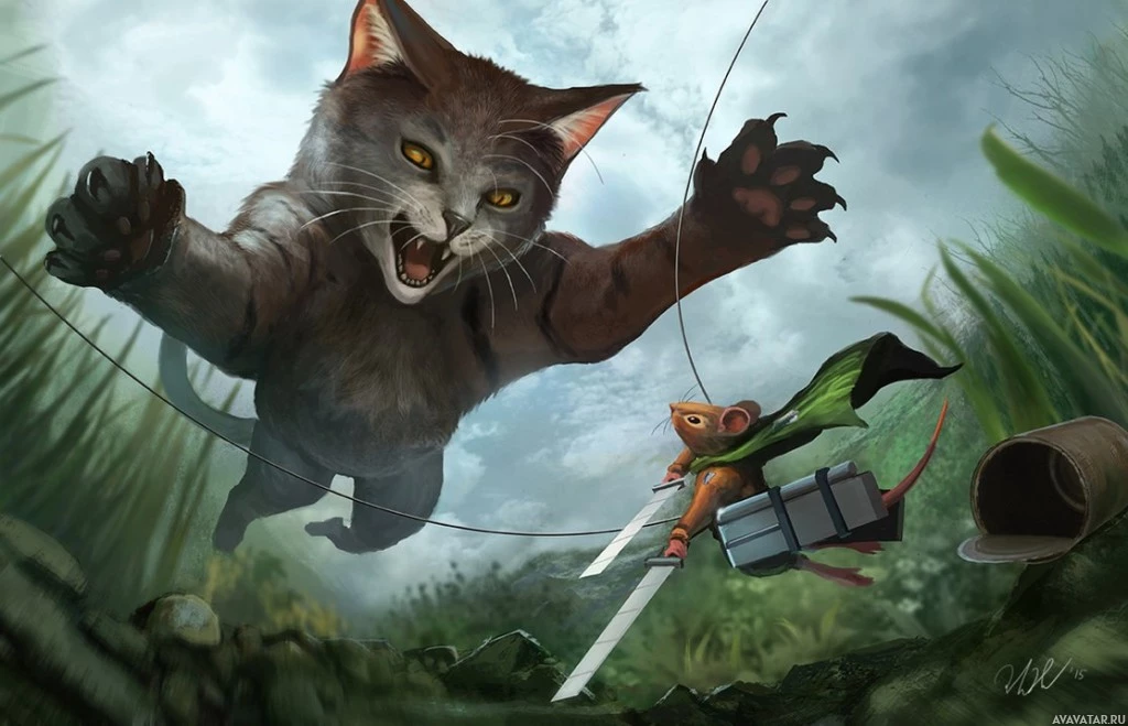a fantastical scene with two animated cats engaged in combat. One cat, which appears to be larger and more aggressive, is wielding a sword and making