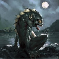 a fantasy creature known as a murlock, which is a hybrid of human and fish. It is characterized by its fish-like features such as scales, fins, and gills, while also having human-like arms and torso. The murlock appears to be sitting on rocks in what looks like a moody, possibly nocturnal setting, with