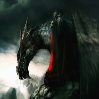 a fantasy scene featuring a dragon and a figure that appears to be a wizard or sorcerer. The dragon, with its