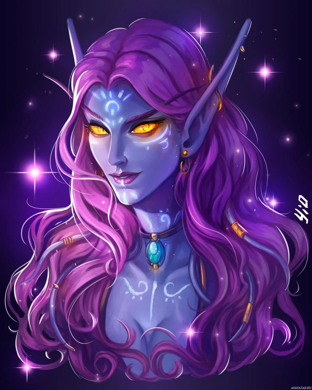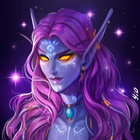 purple hair and a neutral expression on their face. They have pointed ears, which are common in