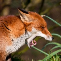 The picture shows a fox in the wild. It appears to be sniffing or investigating something on the ground, perhaps food or an interesting scent. The fox's fur looks dense and its color is that of a typical red fox, with darker reddish tones.