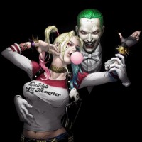 Harley Quinn and the Joker, from the Batman universe. They are depicted in a pose that suggests