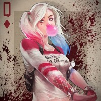 iconic outfit with the Joker's face on her shirt and holding a gun in one hand while blowing bubbles with her other hand. The background has a grunge texture and the image is bordered by playing card motifs, adding to