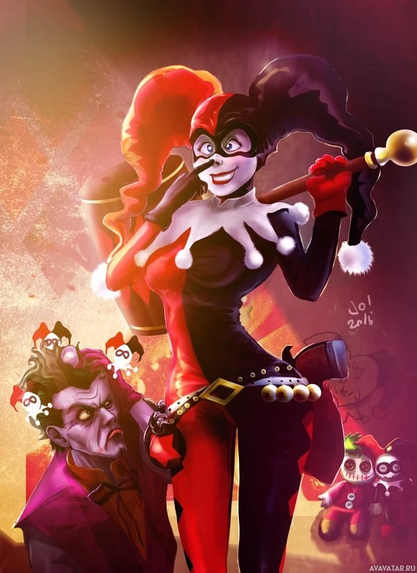 Harley Quinn from the comic book series Batman. She is wearing her iconic black and red jester costume with a white diamond pattern on it, and she has