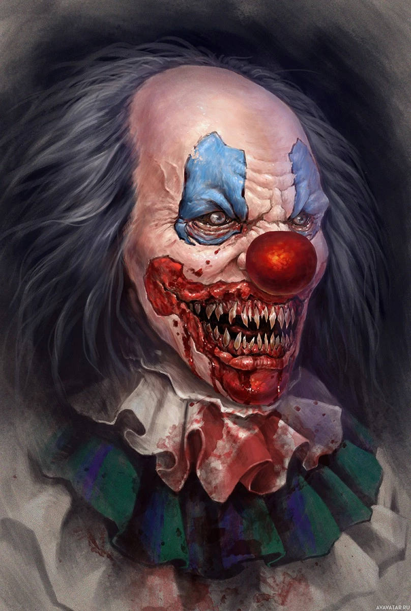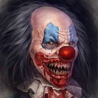 a classic clown, but with a grotesque twist. It's a digital artwork that combines elements typically associated with clowns and