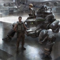 advanced environment. There is a person seated inside what looks like a tank-like vehicle, suggesting this could be a mechanized