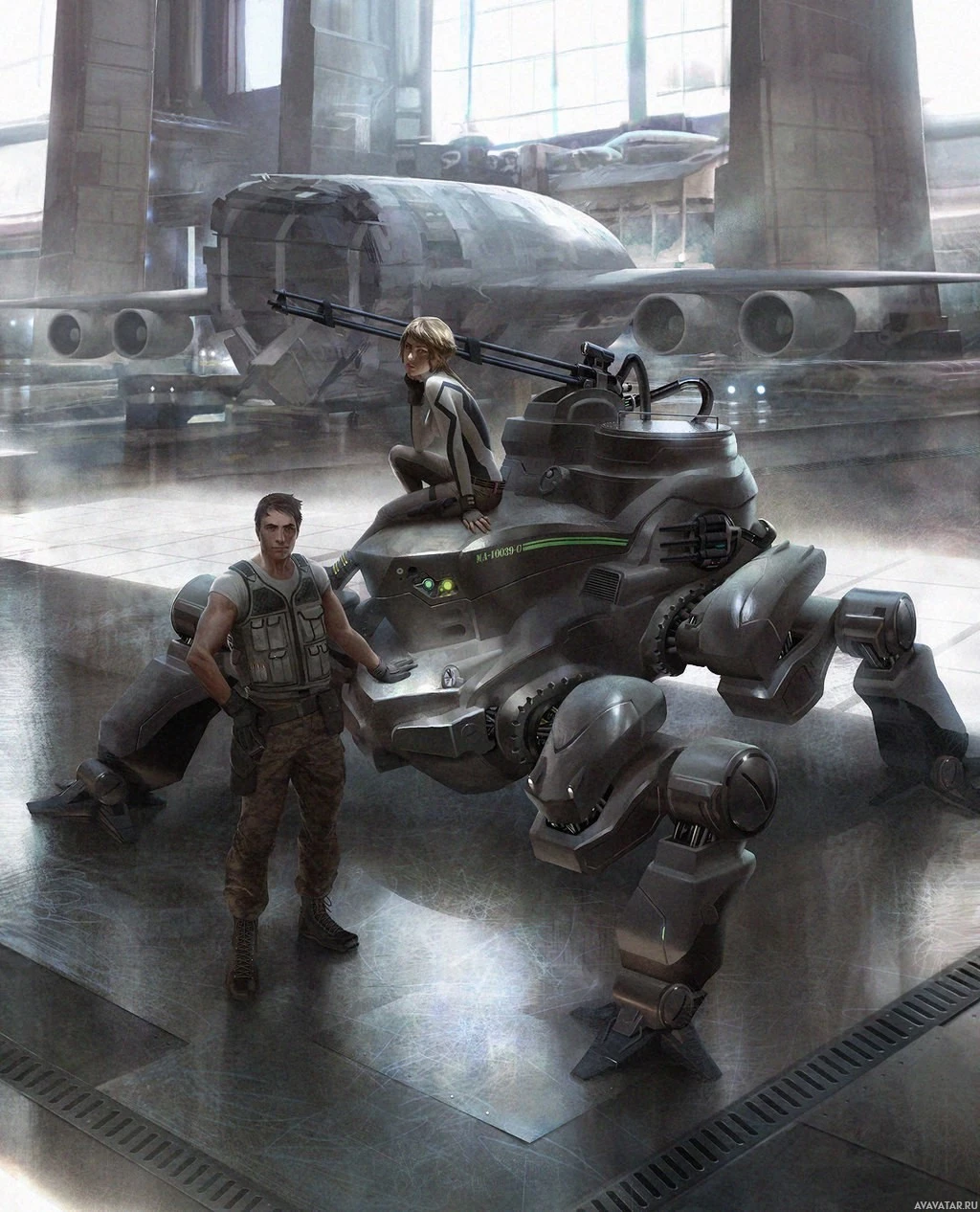 combat suit or mobile weapon platform. Another individual stands beside the vehicle, wearing what seems to be